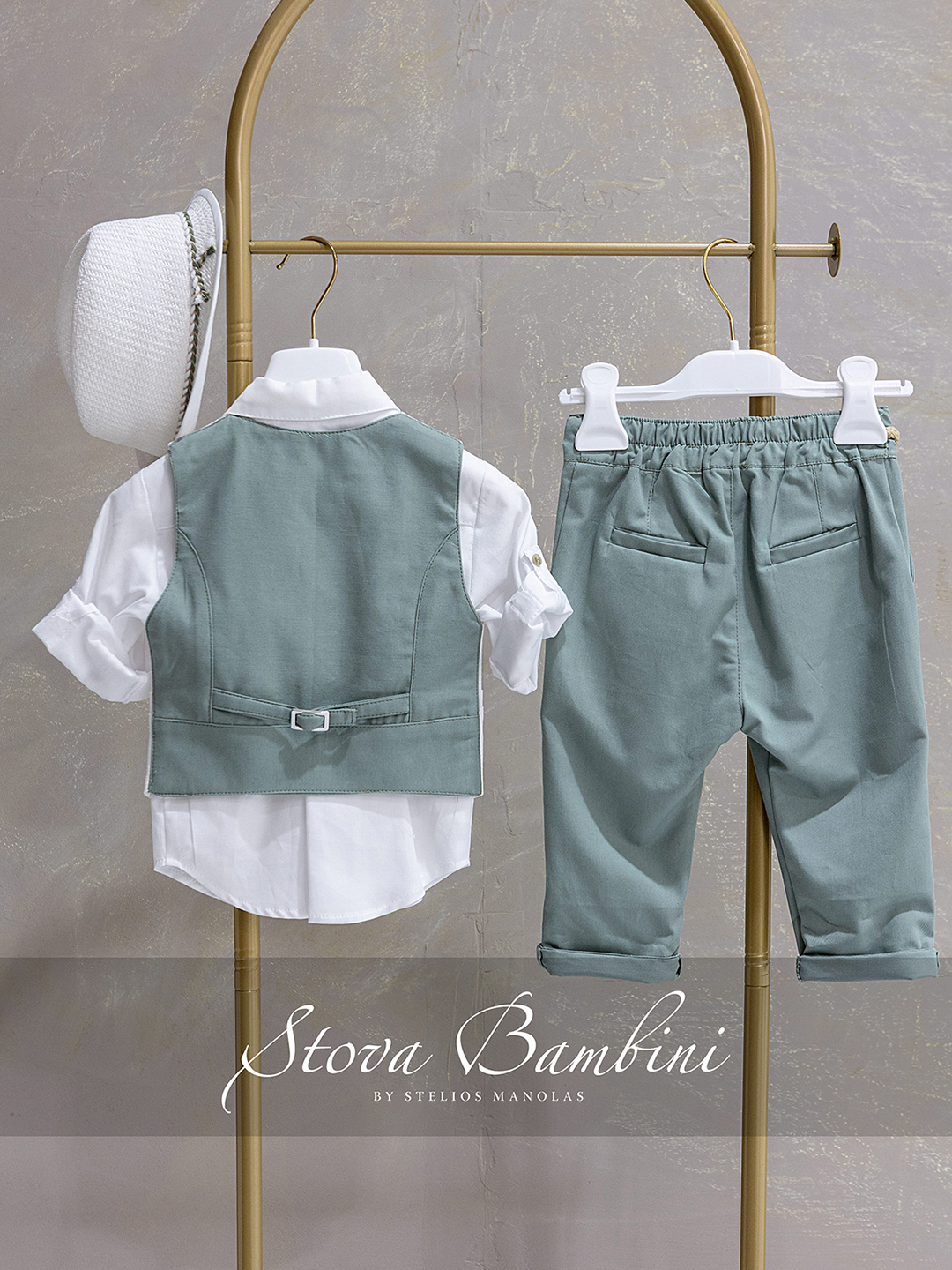 Βαπτιστικό σύνολο 5 τεμ. σχεδιασμένο με κομψότητα και διαχρονική αισθητική, από 100% top quality υλικά. Το κρουαζέ γιλέκο σε white απόχρωση από υψηλής ποιότητας βαμβακερό ύφασμα Ισπανίας με φυσική ανάγλυφη υφή αποπνέει έναν διαχρονικό χαρακτήρα, ενώ διακοσμείται με ιδιαίτερα κουμπιά τύπου ταρταρούγα δημιουργώντας ένα υπέροχο κλασσικό βαπτιστικό σύνολο. Το λευκό πουκάμισο από 100% βαμβάκι Ισπανίας, προσθέτει φρεσκάδα και καλοκαιρινή κομψότητα, ολοκληρώνοντας ιδανικά την εικόνα. Η βαμβακερή καπαρντίνα Ισπανίας σε απόχρωση μέντας που έχει επιλεχθεί για το παντελόνι σε χαλαρή, άνετη γραμμή προσφέρει άνεση και στυλ, ιδανικό για τις ζεστές ημέρες του καλοκαιριού. Το σύνολο ολοκληρώνεται με ένα υπέροχο παπιγιόν από το ύφασμα του παντελονιού.
