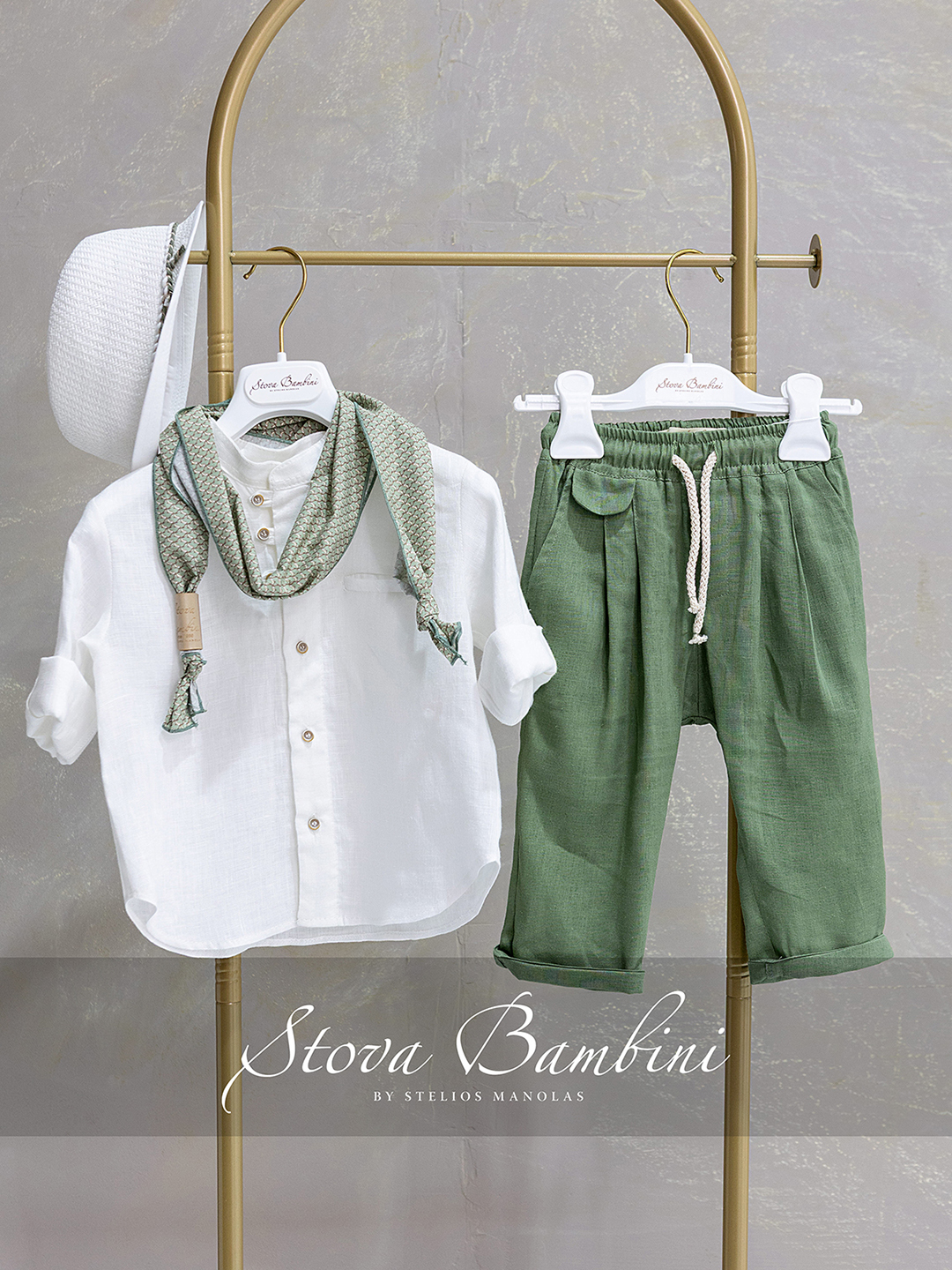 Αέρινο καλοκαιρινό βαπτιστικό σύνολο από 100% υψηλής ποιότητας linen, σχεδιασμένο για κομψές και ανάλαφρες εμφανίσεις τις πιο ζεστές ημέρες του καλοκαιριού. Η λευκή λινή πουκαμίσα Stova συνδυάζεται αρμονικά με το λινό παντελόνι -με κορδόνι περίσφιξης- σε dusty mint απόχρωση, δημιουργώντας ένα σύνολο που αποπνέει φυσική κομψότητα και διαχρονικό στυλ. Το σύνολο ολοκληρώνεται με υπέροχο Ιταλικό printed φουλάρι και ασορτί καπέλο — για μια ολοκληρωμένη, καλοκαιρινή εμφάνιση που δεν φωνάζει, αλλά ξεχωρίζει.