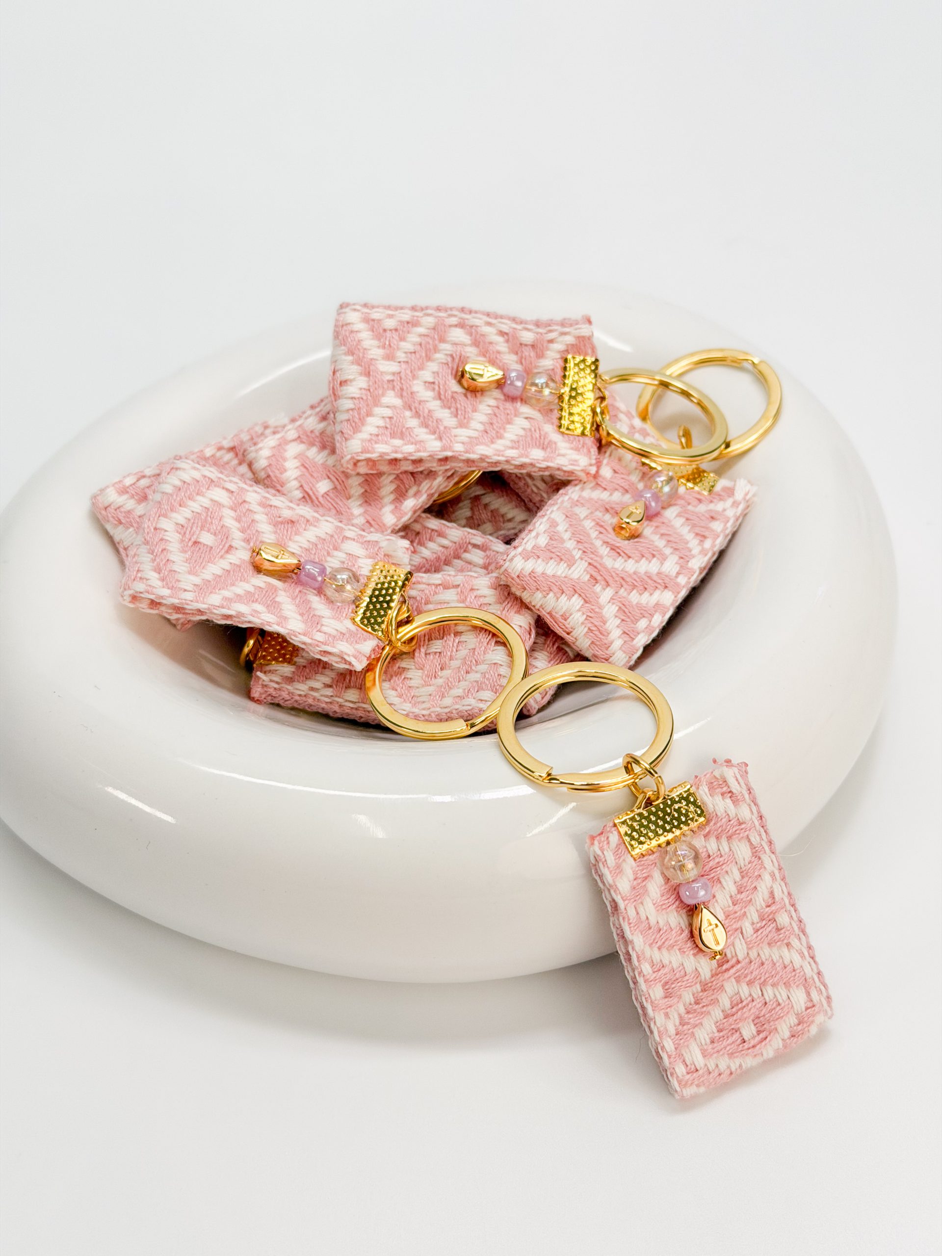 Μαρτυρικό μπρελόκ με δίχρωμη ροζ άσπρη τρέσα,επιχρυσωμένο σταυρό και χάντρες.