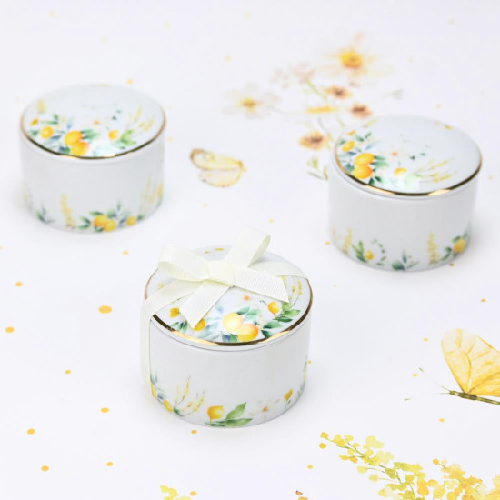 Πορσελάνινη μπιζουτιέρα με μοτίβο λεμονιών και λευκών λουλουδιών, που αποπνέει φρεσκάδα και καλοκαιρινή διάθεση.
