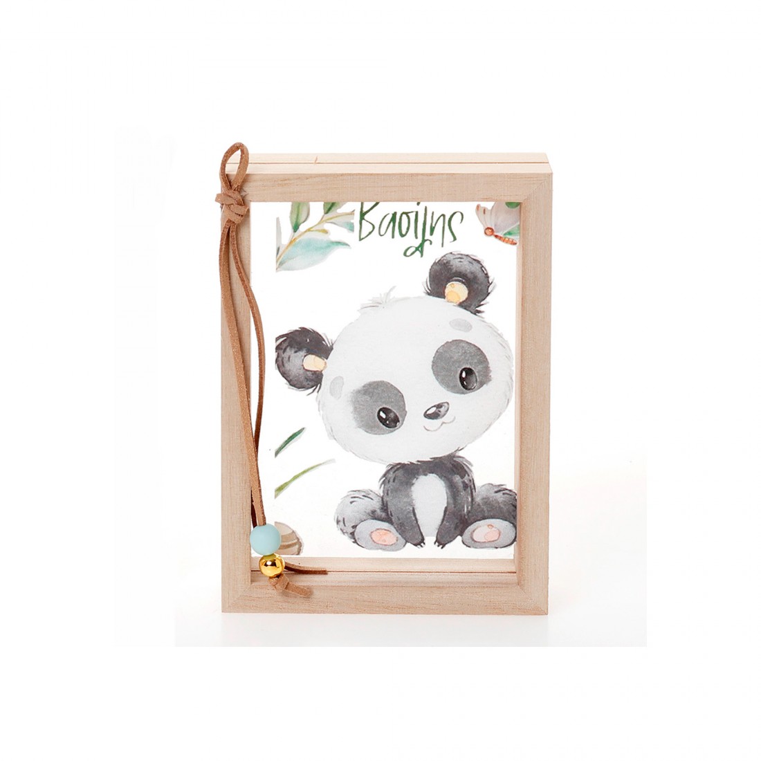 Χειροποίητη ξύλινη κορνίζα με διαφανές plexiglass, διακοσμημένη με χαριτωμένο θέμα πάντα. Περιλαμβάνει προσωποποιημένη εκτύπωση με όνομα, καθιστώντας την ιδανική για διακόσμηση παιδικού δωματίου ή μοναδικό δώρο βάπτισης.
