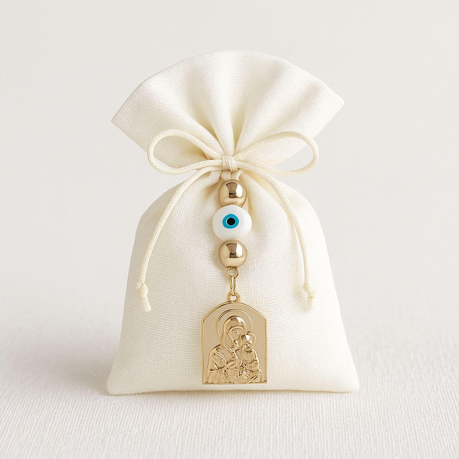Κάθε μπομπονιέρα, πλαισιωμένη από λεπτομερή χρυσή Παναγίτσα και ματάκι, αποτελεί ένα ξεχωριστό δώρο που θα προσφέρει προστασία και ευλογία σε κάθε ταξίδι των καλεσμένων σας.