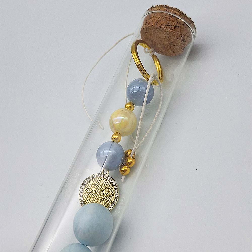 Μπομπονιερα Βαπτισης δοκιμαστικος σωληνας με μπρελοκ Κωνσταντινατο.