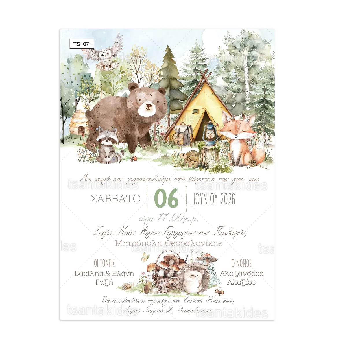 Προσκλητήριο βάπτισης για αγόρι εκτυπωμένο με θέμα Forest Animals.