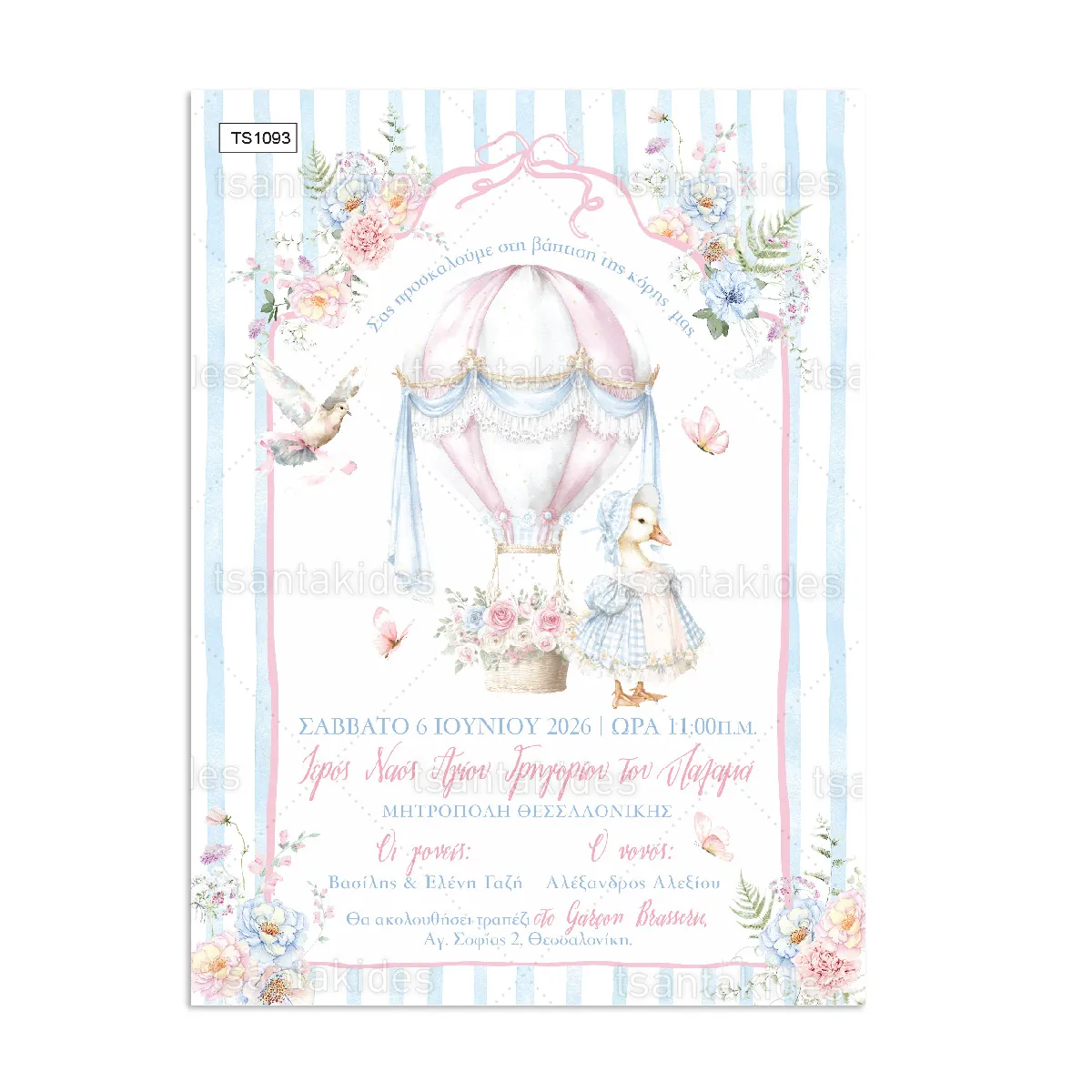 Προσκλητήριο βάπτισης για κορίτσι εκτυπωμένο με θέμα Rose Hot Air Balloon.