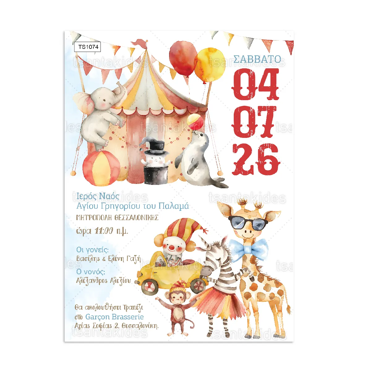Προσκλητήριο βάπτισης για αγόρι εκτυπωμένο με θέμα Circus.