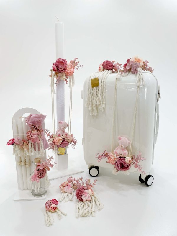 Σετ με λαμπαδα ,Τροχήλατη πλαστική βαλίτσα ταξιδιού με χειροποίητη ζωγραφική και στολίσματα που την κάνουν μοναδική! Η μίνιμαλ γραμμή της βαλίτσας αφήνει τον πρώτο λόγο στο σχέδιο, δίνοντας τον χαρακτήρα που επιθυμείτε. Γιατί κάθε βάπτιση είναι μοναδική!