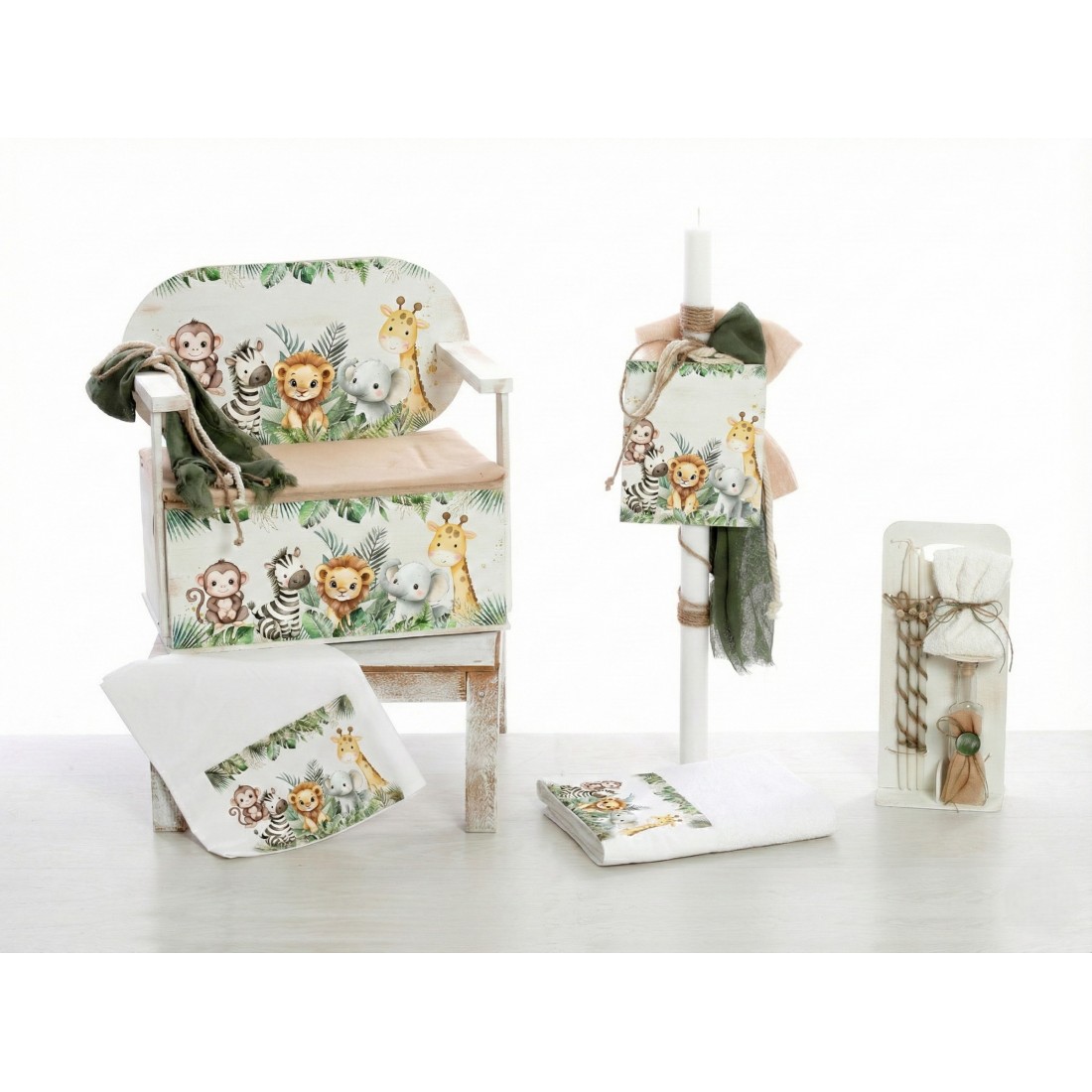 Ολοκληρωμένο πακέτο βάπτισης για αγόρι με θέμα “Jungle Animals” (Ζώα της Ζούγκλας) που περιλαμβάνει ξύλινο παγκάκι-μπαούλο. Μια πρακτική και διακοσμητική πρόταση σε γήινες αποχρώσεις.