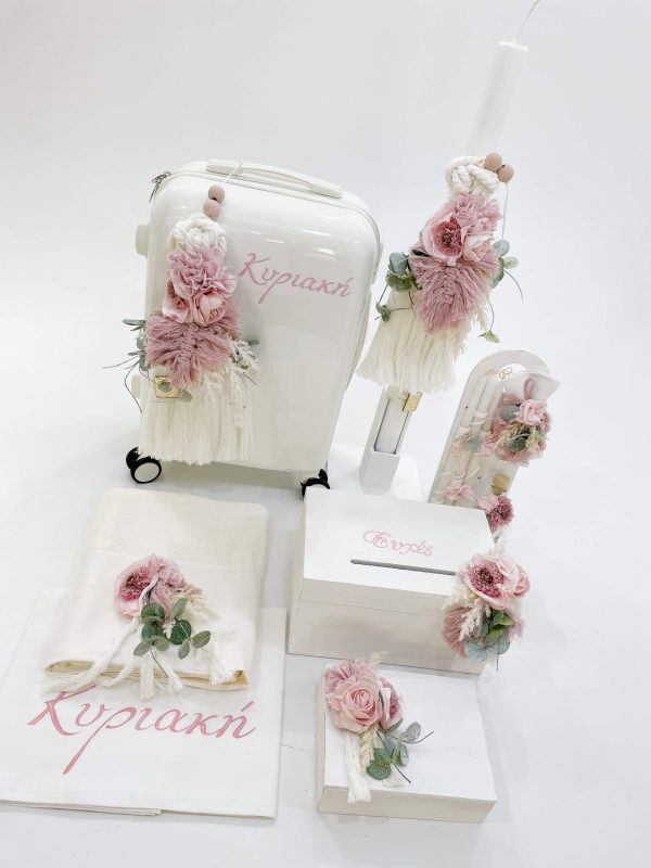 Σετ με λαμπαδα ,Τροχήλατη πλαστική βαλίτσα ταξιδιού με χειροποίητη ζωγραφική και στολίσματα που την κάνουν μοναδική! Η μίνιμαλ γραμμή της βαλίτσας αφήνει τον πρώτο λόγο στο σχέδιο, δίνοντας τον χαρακτήρα που επιθυμείτε. Γιατί κάθε βάπτιση είναι μοναδική!