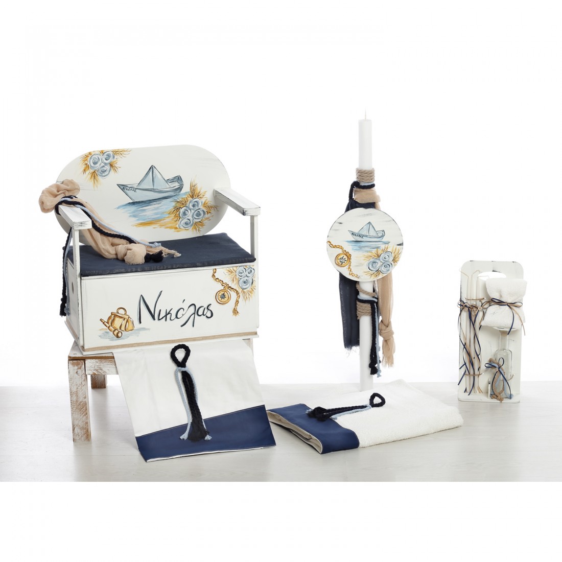 Περιλαμβάνονται: Παγκάκι Βάπτισης, Λαμπάδα, Λαδόπανα, Σετ λαδιού (3 κεράκια κολυμπήθρας, μπουκάλι λαδιού και σαπουνάκι)
