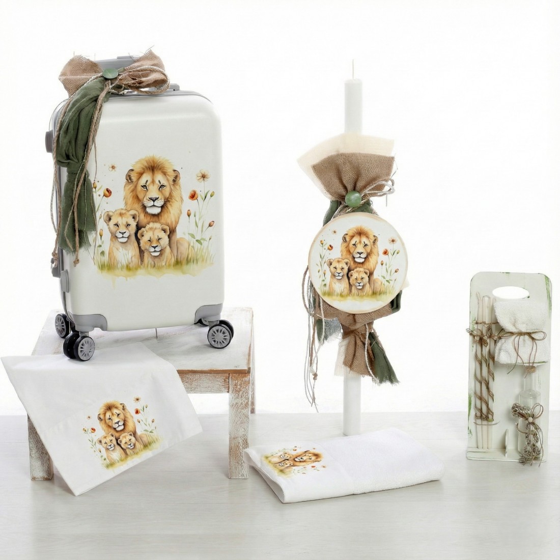 Ολοκληρωμένο πακέτο βάπτισης για αγόρι με θέμα “Lion Family” (Οικογένεια Λιονταριών) σε βαλίτσα τρόλεϊ. Ένα σετ σε γήινες αποχρώσεις, που συνδυάζει την πρακτικότητα με το rustic/natural στυλ διακόσμησης.