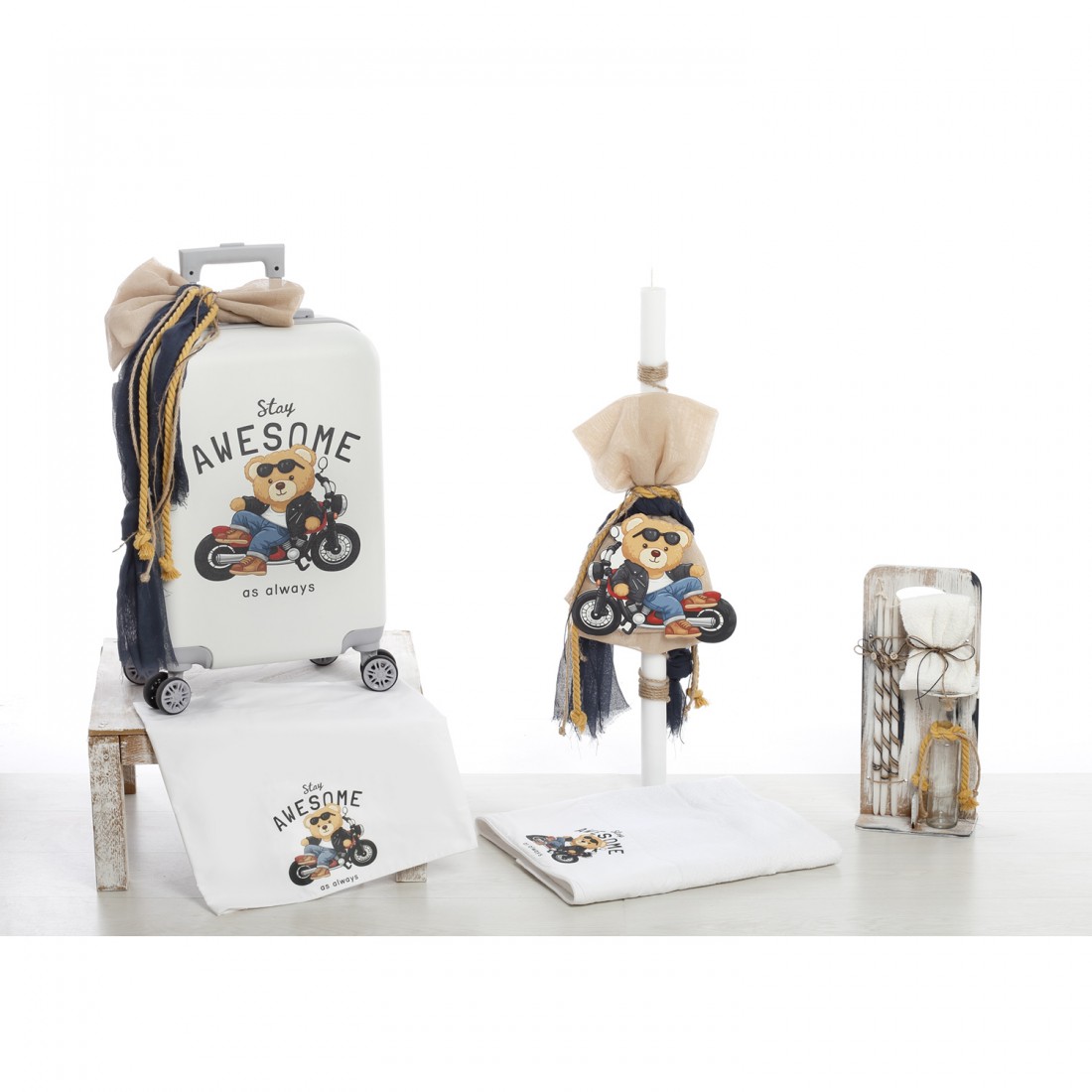 Ολοκληρωμένο πακέτο βάπτισης για αγόρι από τη συλλογή “Stay Awesome Bear”. Μια μοντέρνα, rock και άκρως “cool” πρόταση που συνδυάζει την πρακτικότητα μιας βαλίτσας τρόλεϊ με ένα πρωτότυπο θέμα: ένα αρκουδάκι με γυαλιά ηλίου και δερμάτινο μπουφάν πάνω σε μοτοσυκλέτα.